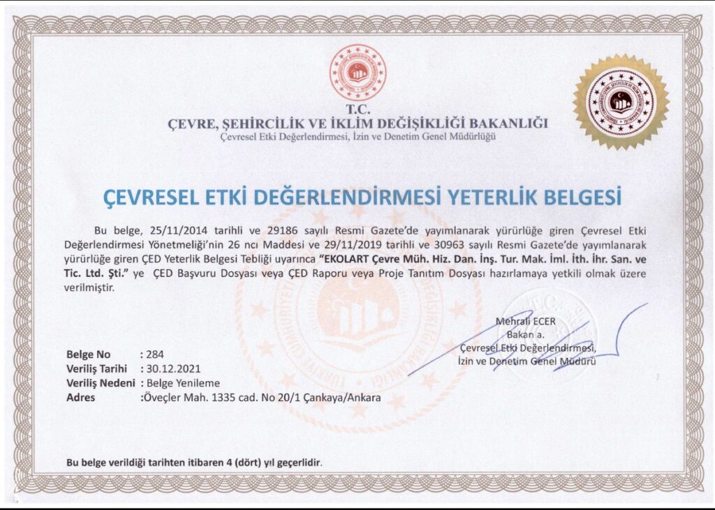 | Çevresel Etki Değerlendirmesi Yönetmeliği ve Çevresel Etki Değerlendirmesi Yeterlik Belgesi Tebliği gereğince ÇED Olumlu kararı verilen projelerin proje sahibi; ÇED sürecinde İnceleme Değerlendirme Komisyonu tarafından belirlenen periyotlarda yatırımda kaydedilen gelişmeleri içeren Proje İlerleme Raporunu T.C. Çevre, Şehircilik ve İklim Değişikliği Bakanlığından ÇED Yeterlik Belgesine sahip Kurum/Kuruluşlardan ve söz konusu projeye ilişkin ÇED Raporunu hazırlamayan Kurum/Kuruluşa hazırlatarak T.C. Çevre, Şehircilik ve İklim Değişikliği Bakanlığı’na elektronik ortamda gönderilmesini sağlamakla ve yapılacak denetimlerde ibraz etmekle yükümlüdür. Şirketimiz T.C. Çevre, Şehircilik ve İklim Değişikliği Bakanlığından Proje İlerleme Raporlarını hazırlamaya yetkili bir kuruluştur. |